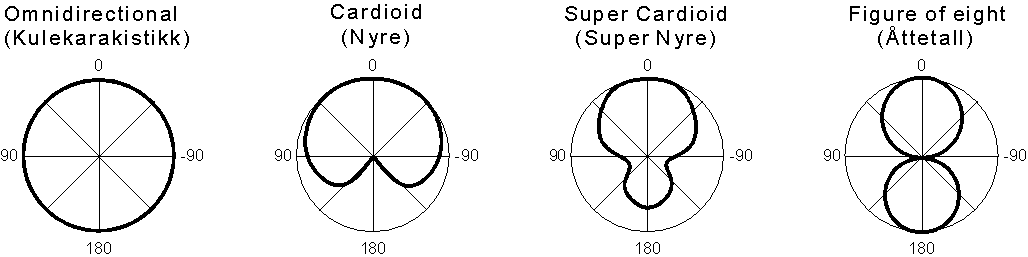 Med dette mener vi retning sfølsomheten for en mikrofon. Vi deler de inn i fire typer, men det finnes et utall av overgangstyper. En del dyrere kondensatormikrofoner har kontroller for kontinuerlig overgang mellom de forskjellige karakteristikkene.