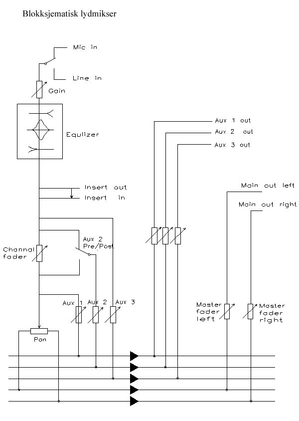 For å følge lyden fra ende til annen, begynner vi øverst på inngangsmodulen. D.v.s. først stiller man master fader og kanal fader i max posisjon (Ingen demning av signalet) Ekulizeren settes i utgangsposisjon (ingen korrigering). Alle tappninger skruer av. Så justeres inngangen slik at lydkilden får fult utslag (0 db) på utgangen.