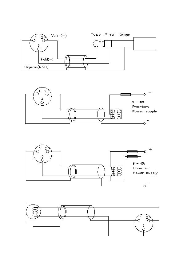 Skjema viser hvordan man kobler spenning til disse mikrofonene. Ubalanserte mikrofoninnganger kan derfor ikke benyttes til kondensatormikrofoner med mindre man har en annen form for kraftforsyning.
